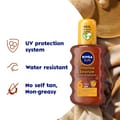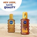 NIVEA SUN Tanning Oil Spray provides UVA/UVB protection and protects against sunburn with SPF 6 and supports a golden, intense and long-lasting tan. The formula with Vitamin E and Jojoba Oil leaves a smooth and silky skin feeling.